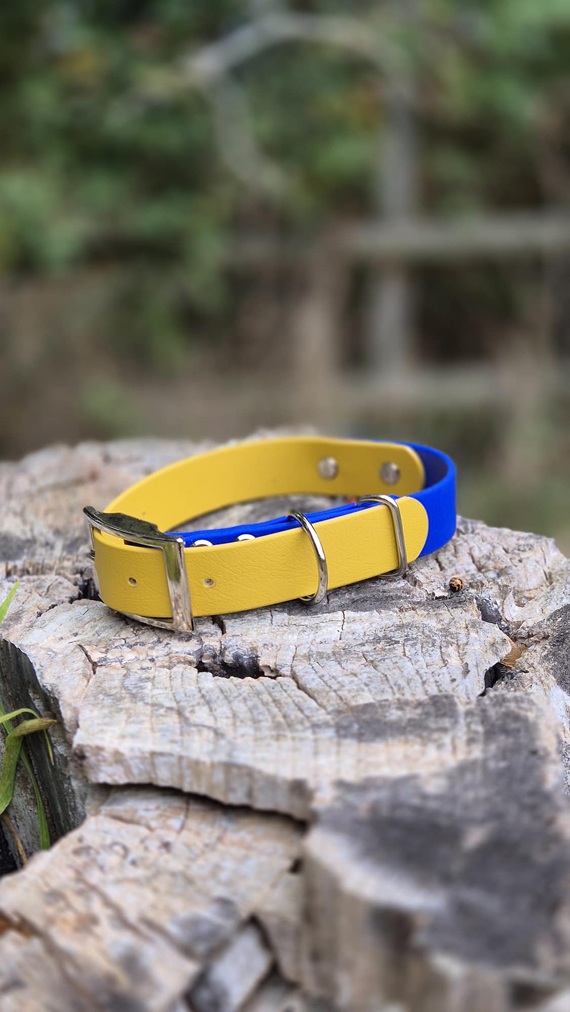 A combination of mustard yellow brings the glow of sunlit dunes and wildflower fields, while the dark blue mirrors the quiet strength of deep waters and midnight skies. Made from biothane, offering the supple look and feel of leather with the durability, waterproofing, and easy-clean nature of modern materials.